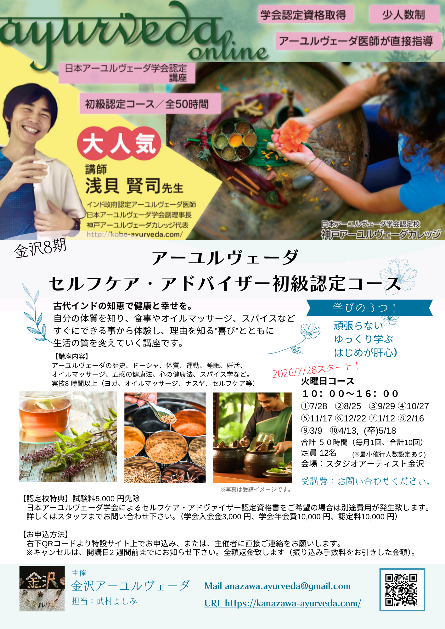 | ●開催条件 | ※ 講師 Dr.浅貝(神戸アーユルヴェーダカレッジ主催) の講座は全国どこで受講されても同内容・同資格取得。 ※ 修了書発行あり。 ※ 講座途中に休憩1時間あり。 ※ 開催は初回開始日の1ケ月前(6月末)までに決定します。 ※ 催行人数に満たない場合は、対面日程調整、または、オンライン講座で調整開催で再募集いたします。 ※ 開催場所は実技内容によっては市内別場所で行います。 ※ この講座内での実技・事務・ご相談は金沢アーユルヴェーダ が全担当致します。 |